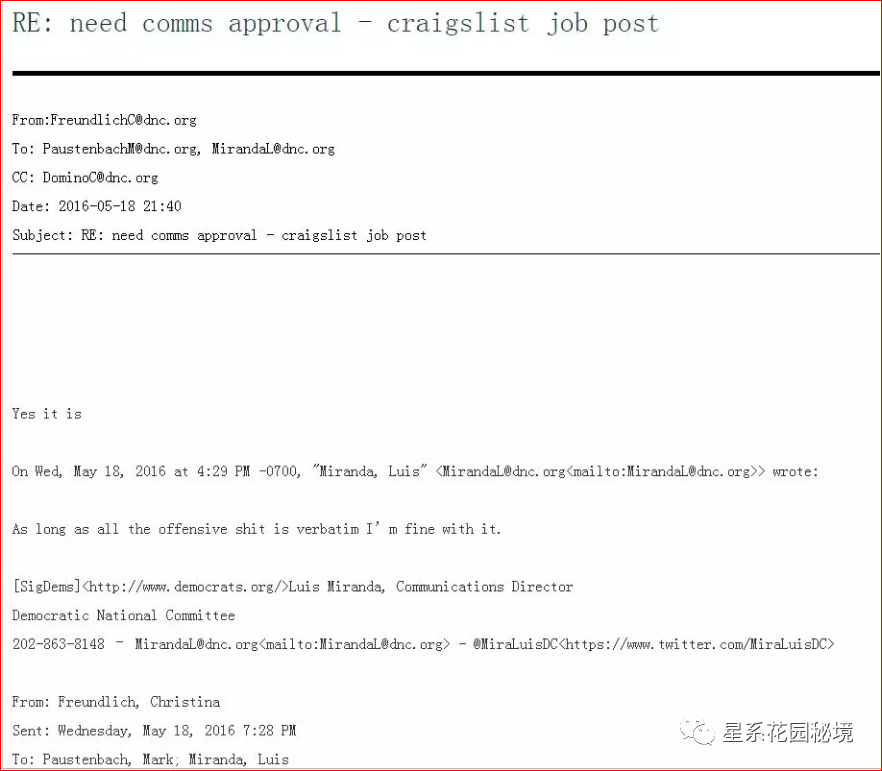 有封邮件很劲爆,它是汇报“彻底搞臭川普计划”进度的,这其中,有民主党全国委员会派人混入川普公司,在其网站发布虚假招聘信息,专业打造川普公司歧视女性的假象,也营造川普本人是个变态狂的感觉,假的招聘广告写道: