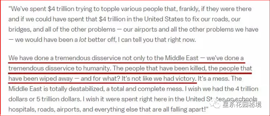 我们不仅对中东造成了巨大的伤害,而且对全人类造成了巨大的伤害,那些被杀害的人,被歼灭的啊,这到底是为了什么啊,我们看上去根本没有取得胜利!其实真TM一团糟…