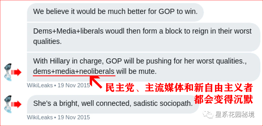 据已公开的维基解密大选前的短信截图显示,它就是希望川普共和党能够获胜。并且把民主党、主流媒体和新自由主义者称作了一个威胁世界的邪恶组合。这反而更加证明,维基解密团队是川普的天然盟友。