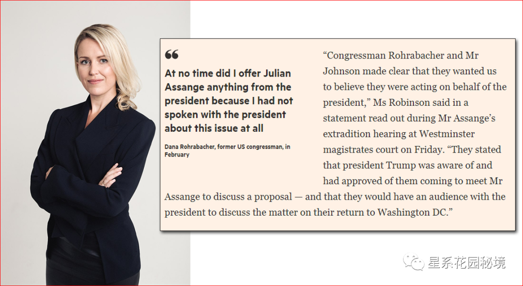 周五,罗宾逊在阿桑奇于威斯敏斯特地方法院举行的引渡听证会上宣读的一份声明中说:“罗拉巴赫议员和川普团队的约翰逊先生明确表示,他们希望我们相信,他们是代表总统行事的。”……“他们表示,川普总统知道并已批准他们前来与阿桑奇会面讨论一项提案——他们将在返回华盛顿特区后与总统讨论这个案件。
